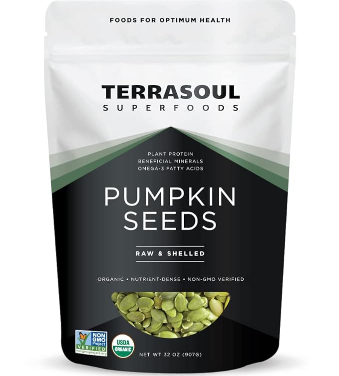 • Terrasoul Superfoods Organic Pumpkin Seeds – nutrient-rich, raw, and crunchy seeds perfect for snacking or recipes.