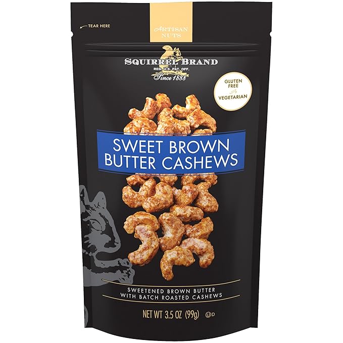 • Squirrel Brand Sweet Brown Butter Cashews, 3.5 Ounces – rich, buttery, sweet cashews for a perfect snack.