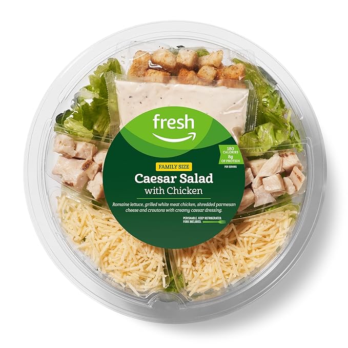 • Amazon Fresh Brand Family Size Caesar Salad: crisp romaine, creamy dressing, crunchy croutons—perfect for sharing.