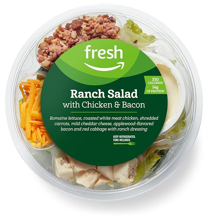 • Amazon Fresh Brand Ranch Salad with Chicken: hearty, ready-to-eat salad with creamy ranch and protein-packed chicken.